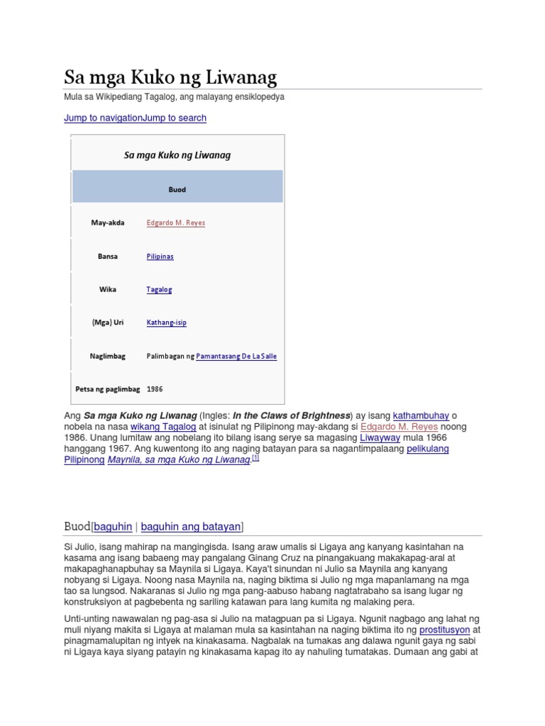 25112018 Sa mga Kuko ng Liwanag is a 1986 Tagalog language novel written by Filipino author Edgardo M. Read Free Sa Mga Kuko Ng Liwanag Edgardo M Reyes pressure. In the Claws of Brightness ay isang kathambuhay o nobela na nasa wikang Tagalog at isinulat ng Pilipinong may-akdang si Edgardo M.
