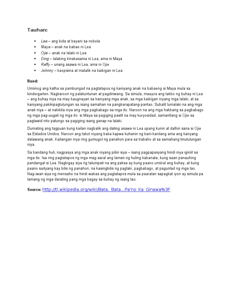 BATA BATA PAANO KA GINAWA LUALHATI BAUTISTA PDF - Description. Nagkaroon ng palatuntunan at pagdiriwang. Nagsimula ang katha sa pambungad na pagtatapos ng anak niyang si Maya mula sa kindergarten.