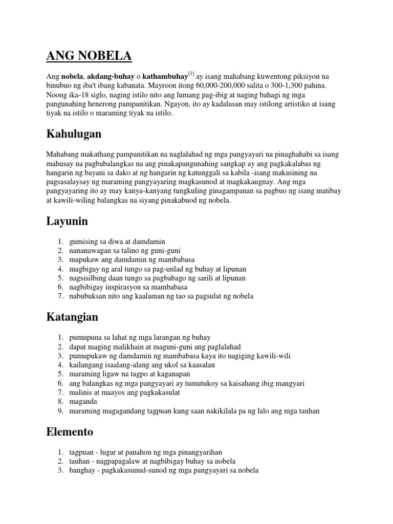 Nabibigyang-kahulugan ang mga piling pahiwatig pahayag na ginamit sa akda. Ang nobela ay isang mahabang kathang pampanitikan na naglalahad ng mga pangyayari na pinaghahabi sa isang mahusay na pagbabalangkas na ang pinakapangunahing sangkap ay ang pagkakalabas ng hangarin ng bayani sa dako at ng hangarin ng katunggali sa kabila -isang makasining na pagsasalaysay ng maraming pangyayaring magkasunod at magkakaugnay. May 5 elemento ang isang nobela.