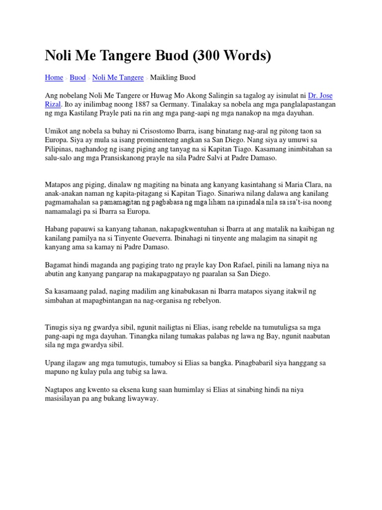 Noli Me Tangere Buod 300 Words Ang nobelang Noli Me Tangere or Huwag Mo Akong Salingin sa tagalog ay isinulat ni Dr.