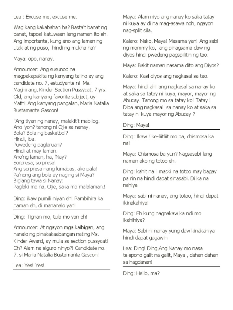 Simple ang buhay ni Lea bilang isang empleyado at sumusuporta sa isang samahan. Please give them a big hand Palakpakan Itinaas nií Lea ang nakahanda nang kamera. Hindi niya napansin ang pagbabago ng kaniyang mga anak sa bilis ng takbo ng buhay.