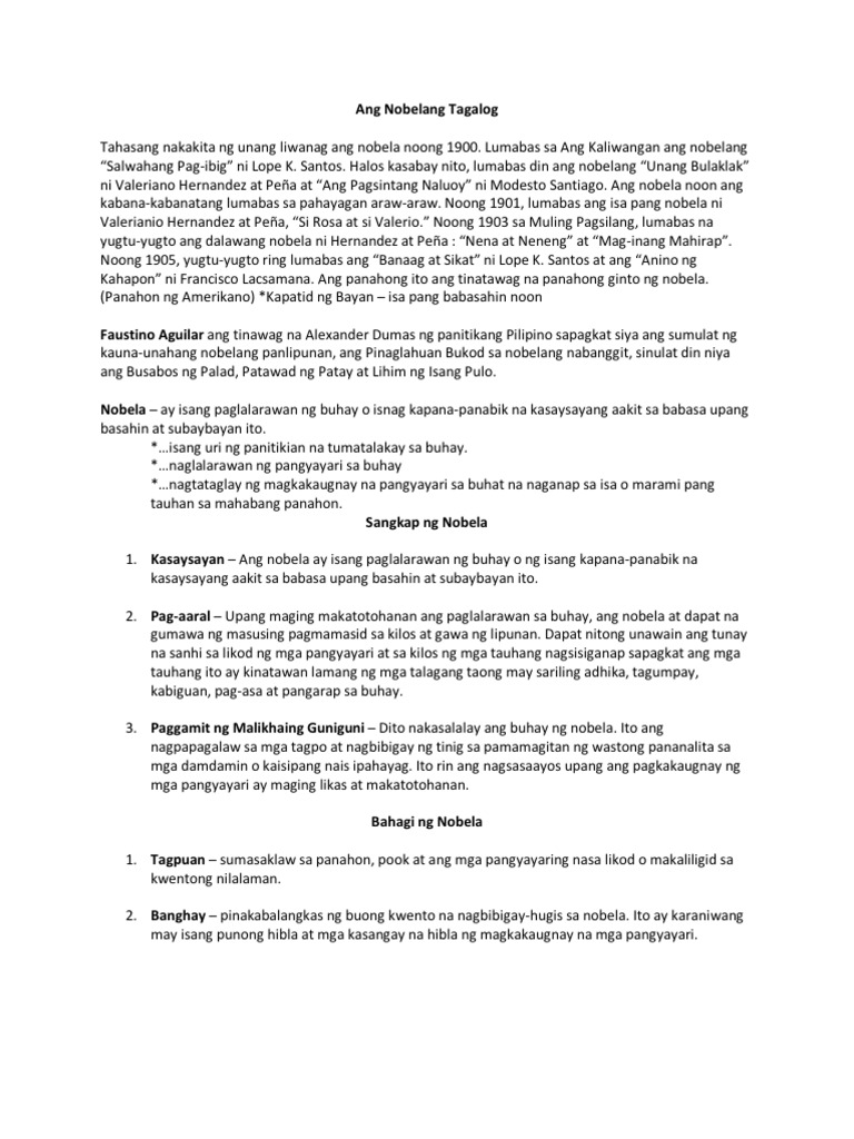 Kahit noong mga taong nagsisimula pa lang na sumulong ang pakikibaka para sa isang malayang konseho at pahayagan ng mga mag-aaral sa UPHSL itinuring ko na ang nobela bilang nirerekomendang reading material para sa pagmumulat at pag-oorganisa sa masang estudyante. Sa pagbasa nauunawaan natin ang mga bagay. Ang nobela o kathambuhay ay isang mahabang kuwentong piksyon na binubuo ng ibat ibang kabanata.