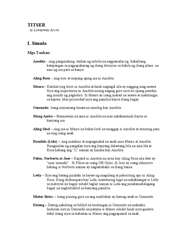 Ang nobelang Titser ni Liwayway Arceo ay sumesentro sa buhay ng mag-asawang Amelita at Mauro na kapwa pinili ang propesyon ng pagtuturo. Abamongga Lea Sheila Nenita TAUHAN. Sa kabuuan ng nobela nakagawa si Achebe ng isang kamangha-manghang gawa ng sining kung saan ay nakuha niya ang diwa hindi lamang ng kanyang mga katutubo ngunit pati na din ang kanyang mga mambabasa dahil sa wika ng mga Igbo sa pamamagitan ng paggamit niya ng wikang Ingles.